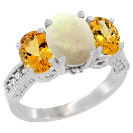 14K White Gold Diamond Natural Opal Ring 3-Stone Oval 8x6mm with Citrine, sizes5-10