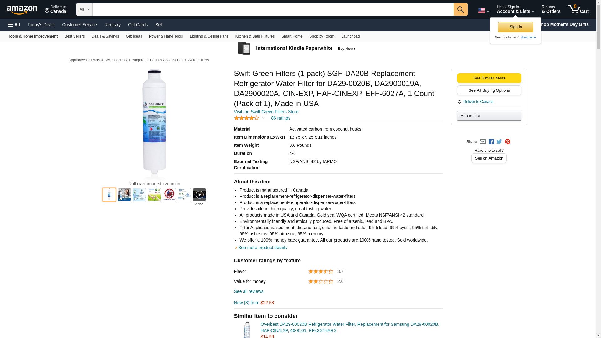 Samsung DA29-00020B Compatible Replacement Refrigerator Water Filter. The use of coconut shell carbon creates a more effective filtration media and also makes the water taste sweeter than replacement refrigerator filters made from coal-based carbon. The pricing is slightly higher than coal-based carbon fridge filters, but the environmental and taste aspects, we feel justify the slight additional costs. The Swift Green Filter SGF-DA20B meets NSF standard 42 for contaminant reduction. Independent lab testing by the Water Quality Association for the Swift SGF-DA20B filter shows that it reduces more contaminants than the original equipment Samsung DA29-00020B. This Swift Green Green Filter fits Samsung Refrigerators with a short round filter, see list below. Compatible with any refrigerator that uses the DA29-00003B filter series. Tested and Certified by the Water Quality Association to NSF Standard 42Coconut carbon filter improves the taste and quality of drinking water. Production of the coconut carbon media releases fewer greenhouse gases than conventional carbon based filters. Swift Green SGF-DA20B Refrigerator Filters Contaminant Removal: Chlorine, Taste and Odor Reduction: Filter Life: 6 months. Samsung Water Filter Replacement - Replaces these models of Samsung Filters: HAF-CIN/EXP Filter, HAF-CIN Filter, DA-97-08006A-B Filter, DA29-00020B Filter, DA2900020B Filter