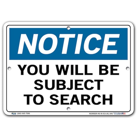 Vestil SI-N-42-A-AL-040 Notice Sign Aluminum .040" Overall Size 10.5"W x 7.5"H You Will Be Subject to Search , 7.5" Height, 10.5" Wide, 0.04" Length