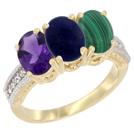 14K Yellow Gold Natural Amethyst, Lapis & Malachite Ring 3-Stone 7x5 mm Oval Diamond Accent, sizes 5 - 10