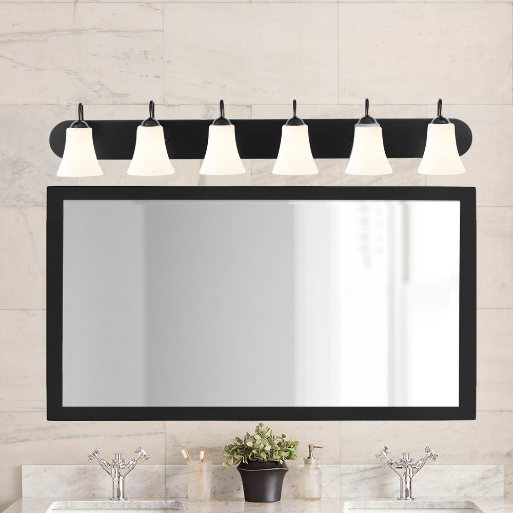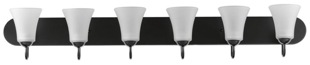 - Six-light bath vanity with simple, curved arms extending from a rounded backplate