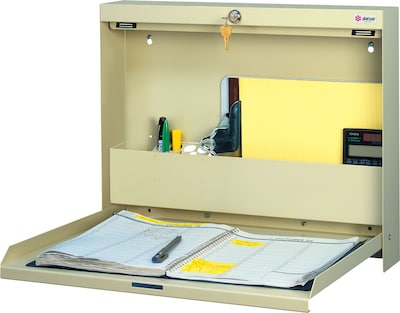 - <b>Price For:</b> Each <b>Overall Depth</b>: 3-3/8" <b>Color</b>: Bone White <b>Material</b>: Heavy Duty Steel, Front: Laminate, Side: Wood <b>Series</b>: WallWrite <b>Width</b>: 20" <b>Type</b>: Fold-Up Desk <b>Height</b>: 16-3/8" <b>Item</b>: Wall Mount Desk,Locking,Bone White <b>Country of Origin (subject to change)</b>: United States