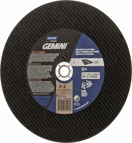 <br /><br /> Item: Abrasive Cut-Off Wheel<br /> Abrasive Wheel Type: Type 1<br /> Abrasive Wheel Diameter: 12"<br /> Thickness: 0.125"<br /> Arbor Hole Size: 20mm<br /> Abrasive Material: Silicon Carbide<br /> Abrasive Grit: 24<br /> Max. RPM: 6360<br /> Series: Gemini Asphalt<br /> Diamond Knockout: No<br /> Application: Ferrous Metal, Nonferrous Materials, Concrete Masonry Asphalt, Aluminum<br />