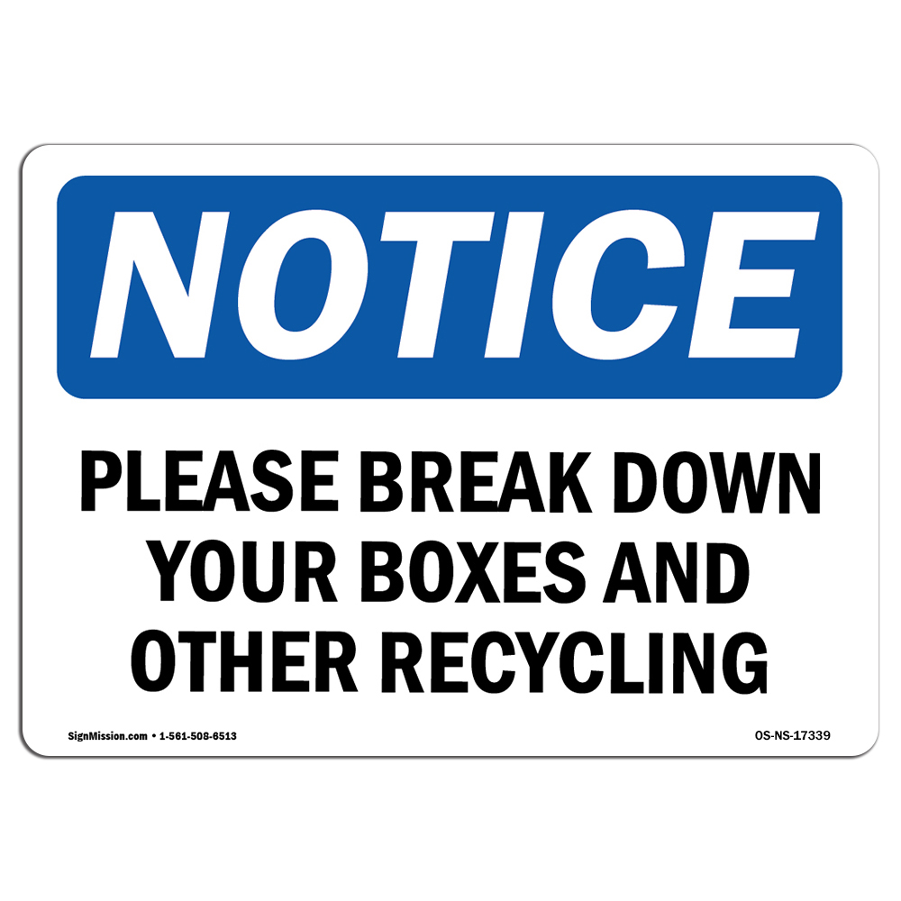 Make Sure You And Your Business are OSHA And ANSI Compliant. Is your business or work space 100% covered and up to code with current signage and labels? Never leave yourself exposed to lawsuits, fines, or reprimands - the integrity of your business and safety of others depends on it. Choose from Thousands of Signs. We have signs in all different shapes, sizes, and colors for almost every single business, workplace, manufacturing plant, production facility, or construction zone. Check out all our first aid signs, danger signs, keep door closed signs, electric panel hazard signs, storage signs, authorized personnel signs, lab chemicals signs and thousands more. Choose from: Aluminum, Rigid Plastic Signs or Adhesive Labels. Our signs are extremely durable yet flexible for even the most intense indoor or outdoor conditions. Vinyl decals are equipped with super strong adhesive so that you can easily apply it to glass windows, aluminum, stainless steel, sanded wood, plexiglass and many more materials and sidings. Aluminum And rigid plastic signage materials are the perfect choice for mounting on walls, doors, fences, construction and caution areas. All of our materials surpass industry standards and will provide years of durability and longevity. Thousands of happy and satisfied businesses worldwide have turned to SignMission for all of their sign needs no matter what industry they are in or what compliance needs they have. Go ahead order your Notice Sign Today!<ul><li>?EXTREMELY DURABLE: All our OSHA safety products are made from commercial grade materials specifically rated for outdoor or indoor usage for years of maintenance free life in the harshest environments. Our signs will last as long as your business!</li></ul>