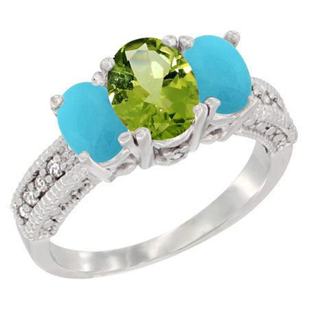 10K White Gold Diamond Natural Peridot Ring Oval 3-stone with Turquoise, sizes 5 - 10
