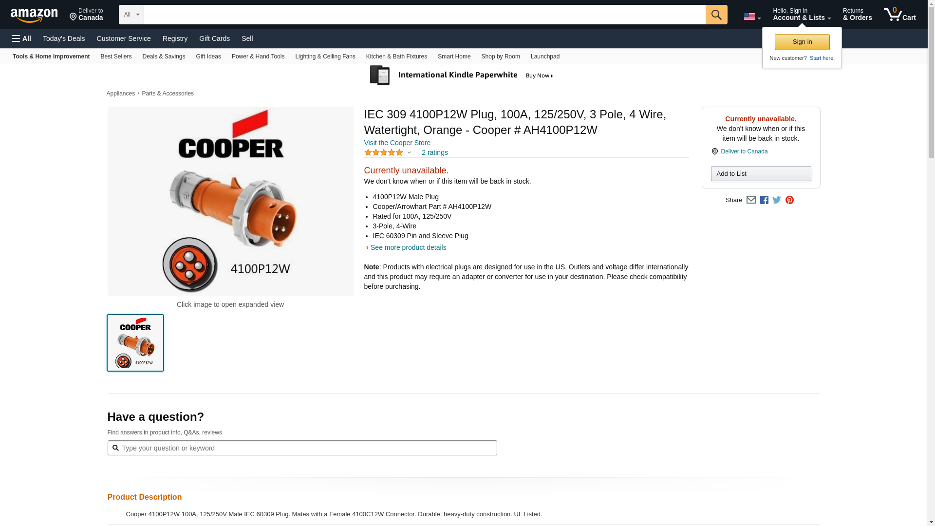 Cooper 4100P12W 100A, 125/250V Male IEC 60309 Plug. Mates with a Female 4100C12W Connector. Durable, heavy-duty construction. UL Listed.
