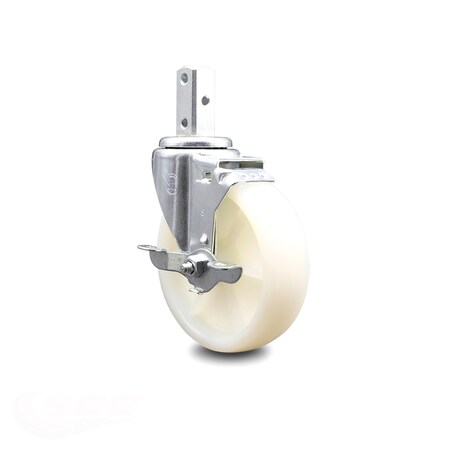 Swivel Square Stem Caster w/5” x 1.25” White Nylon Wheel – 3/4” x 2” Square Stem with (3) 17/64” Diameter Mounting Holes & Top Lock Brakes – 300 lbs. Capacity/Caster – Service Caster Brand