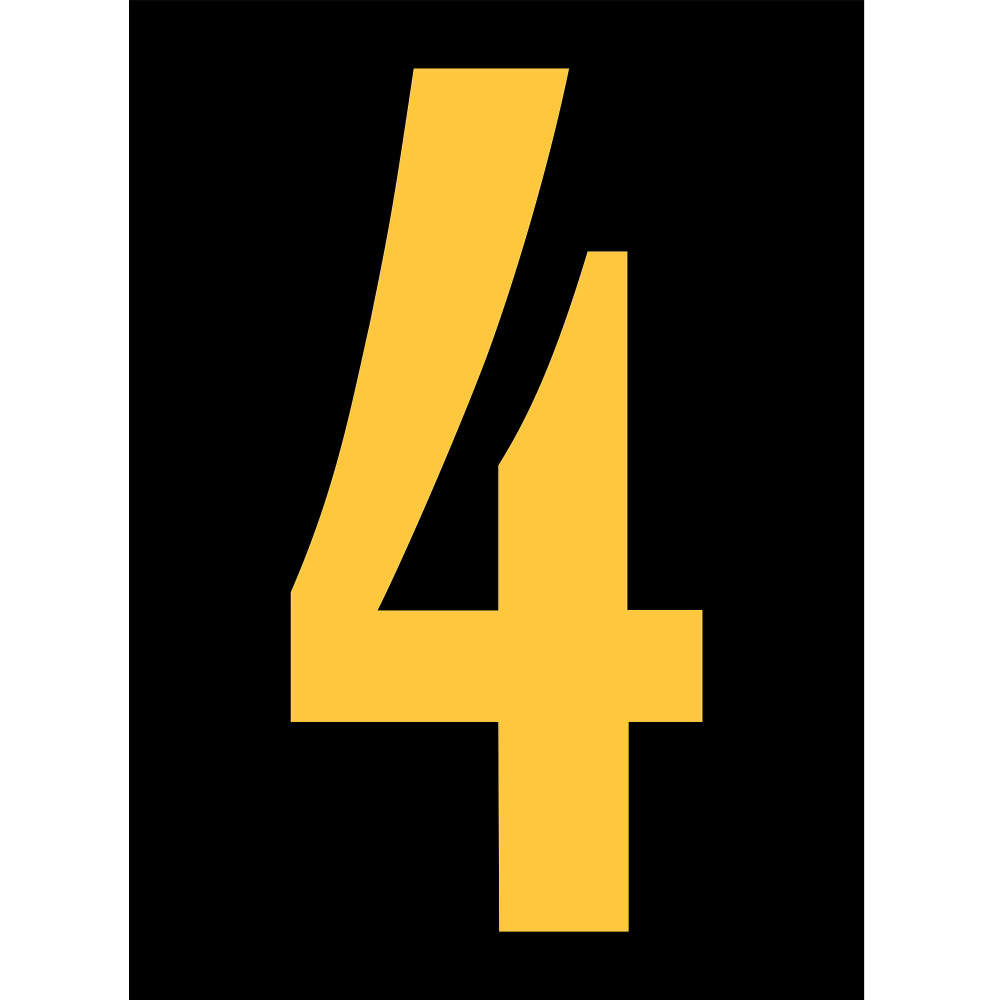 <p><b>Specifications: </b><ul><li>Item:-Reflective Number Label</li><li>Character:-4</li><li>Character Height:-2-1/2"</li><li>Color:-Reflective Yellow on Black</li><li>Material:-Engineer Grade Reflective Film</li><li>Overall Height:-2-7/8"</li><li>Overall Width:-1-3/4"</li><li>Standards:-ASTM D 4956</li><li>UNSPSC:-60111304</li></ul></p>