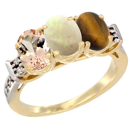 14K Yellow Gold Natural Morganite, Opal & Tiger Eye Ring 3-Stone Oval 7x5 mm Diamond Accent, sizes 5 - 10