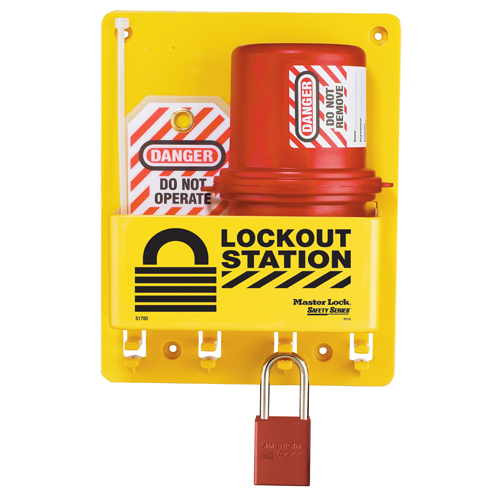 - Includes 3 labels that read, "Lockout Station" in English; Spanish and English; and French and English