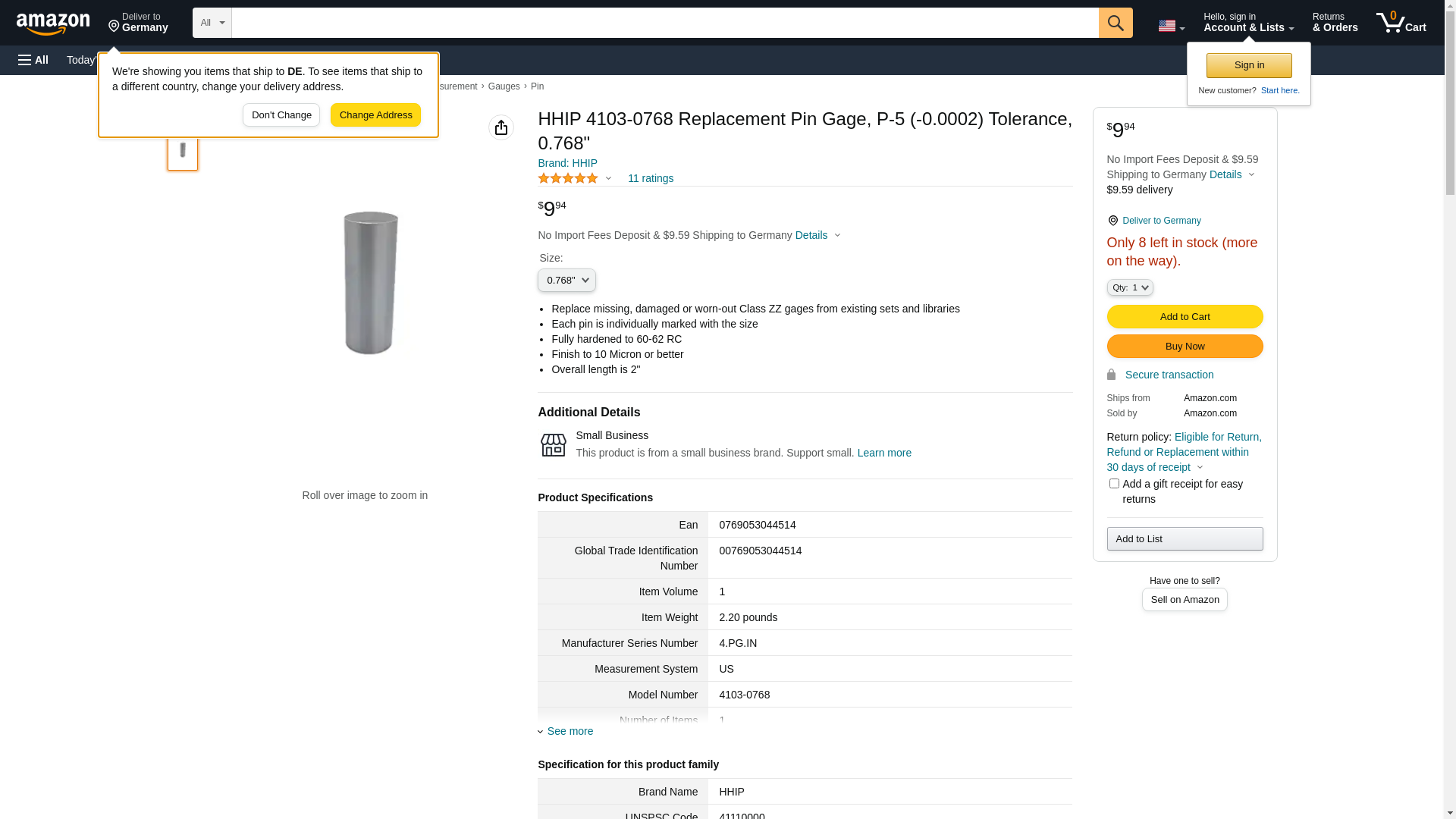 HHIP 4103-0768 Replacement Pin Gage, P-5 (-0.0002) Tolerance, 0.768"