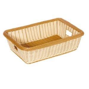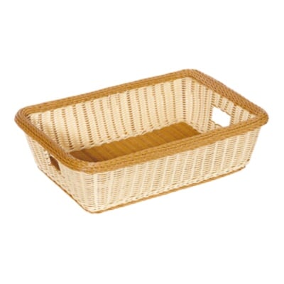 This handled wicker basket is made from the best available plastic for durability. The bin can be used in any department. This handled wicker basket is tu-toned natural and honey for a unique characteristic among displays. The container is dishwasher safe for quick and easy cleaning.