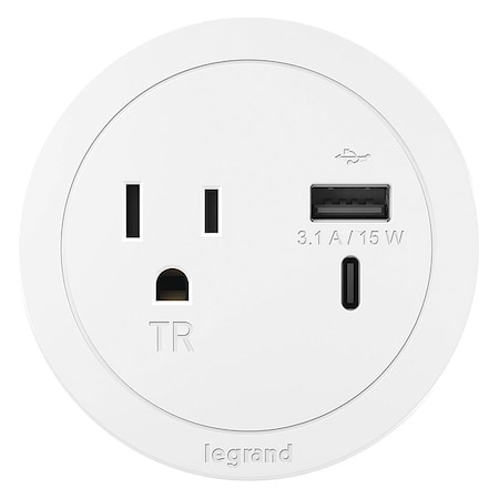 Round Power Strip by Wiremold, Power Strip with USB, Under Desk Power Strip, Mountable Power Strip, Furniture Power Outlet, 15 Amp, 1 Outlet, Type A/C USB, White, 10 Feet