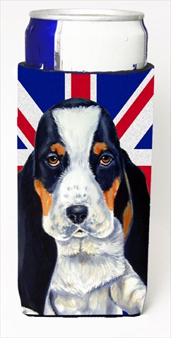 Caroline's Treasures LH9481MUK Basset Hound with English Union Jack British Flag Ultra Hugger for slim cans Can Cooler Sleeve Hugger Machine Washable Drink Sleeve Hugger Collapsible Insulator Beverage