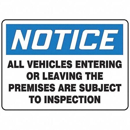 Accuform MADC825VA, 10" x 14" OSHA Notice Safety Sign "All Vehicles Entering ..." Aluminum Legend "All Vehicles Entering or Leaving The Premises Are Subject to Inspection" Features Stands up indoors and out Thin enough to conform to curved surfaces .032 inches thick for strength and flexibility Finished with four mounting holes