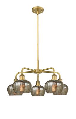 INNOVATIONS 516-5CR-BB-G96 Fenton 5 24.5 inch Chandelier Brushed Brass. Style: Art Nouveau, Industrial, Restoration-Vintage, Transitional . Collection Name: Downtown Urban. Metal Finish(Body): Brushed Brass. Material: Steel, Cast Brass, Glass. Dimension(in): 13.5(H) x 24.5(W) x 24.5(Dia). Bulb: (5)60W Medium Base Incandescent(Not Included). Stem Specs: 1-6 and 2-12 inch (1/2 diameter) stems. Voltage: 120. Dimmable: Yes. Color Temperature (Kelvin): 2200. Color Rendering Index (CRI): 99.9. Lumens: 220. Life Expectancy (Hours): 2000. Glass Shade Description: Mercury Fenton. Glass Type: Mercury; Ribbed. Shade Shape: Bowl. Glass or Metal Shade Color: Mercury. Shade Material: Glass. Shade Dimension(in): 6.5(W) x 4.5(H). Fitter Measurement (Glass Or Metal Shade Fitter Size): Neckless with a 1.75 inch opening. Sloped Ceiling Compatible: Yes. California Proposition 65 Warning Required: Yes. UL/ETL Certification Type: Damp Location.