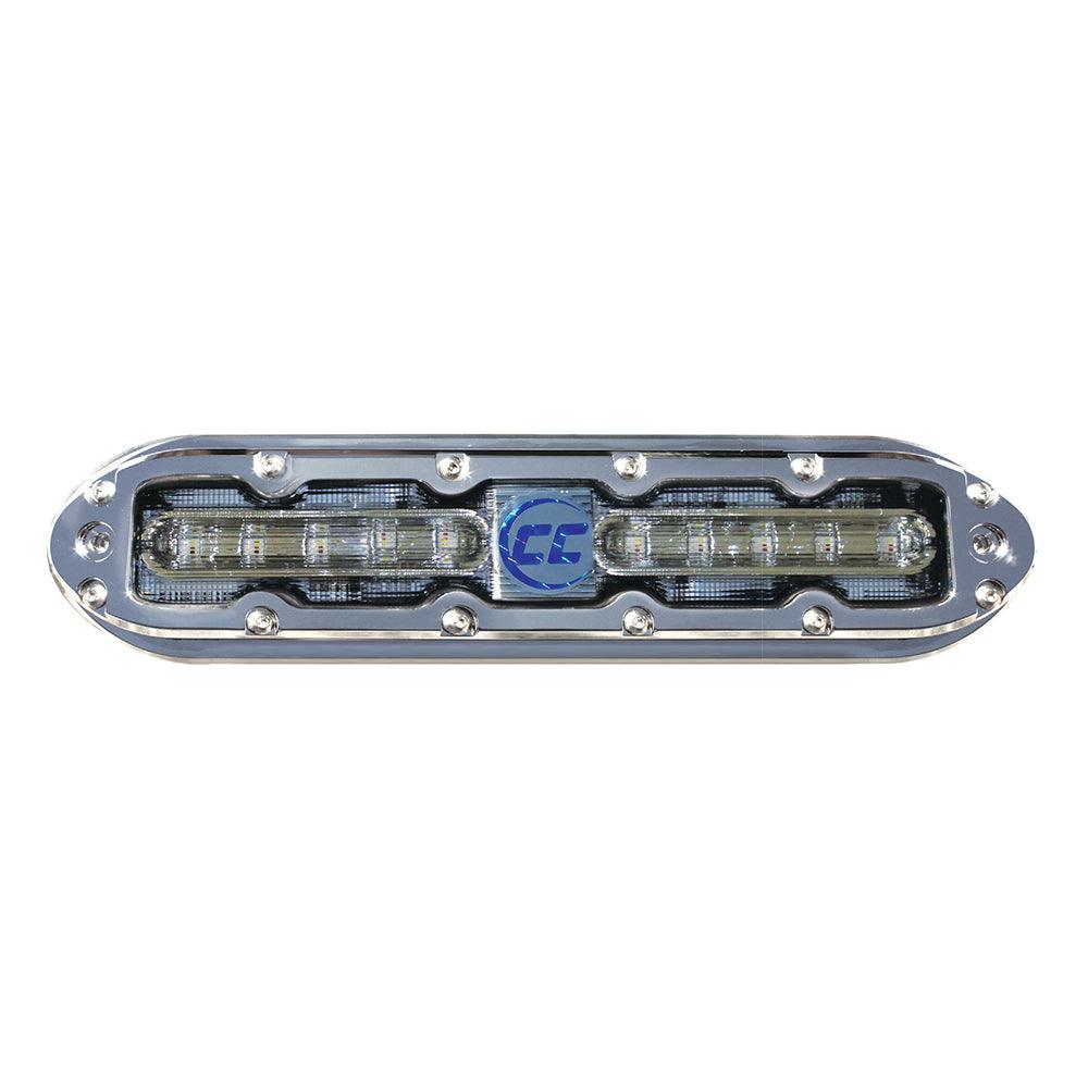 Color Caster Extended Multi-Color Underwater Light - 10' Lead WireThe SCM-10-EXT-CC extended color underwater light provides your vessel with 42 watts of intense LED lighting. Easily switch between 12 standard colors or use an or use a Shadow-NET enabled product to enjoy unlimited colors. The SCM-10-EXT-CC’s low profi le design allows for many mounting locations. The unique stainless steel housing compliments the look of any trailer or lift kept boat.Features:<br>Proprietary clear-gel-fi lled design, injected through entire unit —eliminates condensation and/or water intrusion under stress<br>Tough, polycarbonate lens<br>Passivated stainless steel 316 material provides a durable corrosion resistant housing<br>Transient surge and reverse polarity protection — dramatically prolongs unit life<br>Thermal throttling technology —enables safe operation even out of water<br>From simple on-off to full-feature lighting effects, unit is enabled for a host of control interfaces<br>Select between 12 colors when using a switch or unlimited colors when using Shadow-NET enabled products<br>Specifications:<br>Up to 3,750 lumens<br>120 degree beam angle<br>42 watts power draw<br>3.5 amps operating current draw @ 12 volts<br>10-30 volts input<br>10” (254 mm) x 2.4” (61mm) x 0.5” (13mm)<br>IP68 fully submersible waterproof design<br>10 RGBW LEDs<br>Includes:<br>Lighting unit<br>10’ (6 m) submersible-grade cable<br>2 SS316 1” #8 PH screws<br>Standard 2 year warranty<br><br>Quick Guide (pdf)<br>Brochure (pdf)<br>