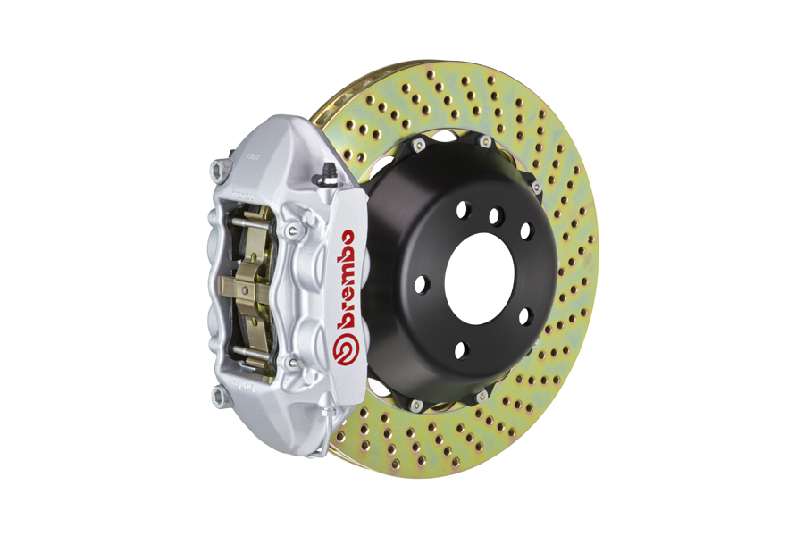 (8P - 365x29 2-Piece - Drilled - Silver) Built for the (06 and up) Audi A3... Brembo Gran Turismo (GT) 4 Piston Systems are excellent for stopping power in everyday traffic, as well as superior high performance street and track driving. They are designed to bolt onto the vehicles original suspension, and are fully compatible with the vehicles stock brake master cylinder and anti-lock braking system (ABS).Click Brembo PDF for the Brembo North America GT CatalogWhile most Brembo Gran Turismo Brake System packages have been developed specifically to replace the vehicle s front brakes (due to the high braking demands encountered there), rear brake systems are also offered for selected applications. For vehicles not offering a Gran Turismo System for the rear axle, Brembo Sport brake rotors (slotted or drilled) are available to replace the stock rotors on the rear axle and provide a matched appearance on all four corners of the vehicle.Gran Turismo Brake Systems packages combine high performance fixed aluminum brake calipers, large diameter 1- or 2-piece vented brake rotors, brake pads, stainless steel braided brake lines and aircraft quality mounting brackets and hardware. (See photo and chart below.) Brake caliper and rotor sizes are selected based on the vehicle s requirements. In most cases, the aluminum calipers are available in red, sliver or black finishes. Additionally, the rotors feature drilled or slotted disc surfaces depending on the vehicle application and brake system selected. All cross-drilled holes are bi-angle chamfered at the rotor s outer surfaces to help reduce the cracking caused by repeated, high stress, high temperature brake applications. Gran Turismo brake discs are coated for corrosion resistance to help eliminate rust and to offer a bold, aggressive appearance to enhance the look of the vehicle s road wheels.1-Piece Drilled/Vented Rotors 2-Piece Drilled/Vented Rotors 2-Piece Slotted/Vented RotorsNotesRequires minor modification to the OEM stee
