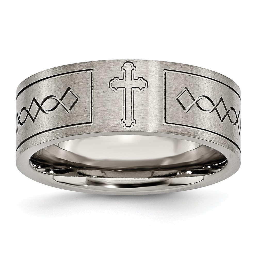 Chisel Flat Brushed Titanium Ring with Cross Design (8.0 mm) - Size 10.5