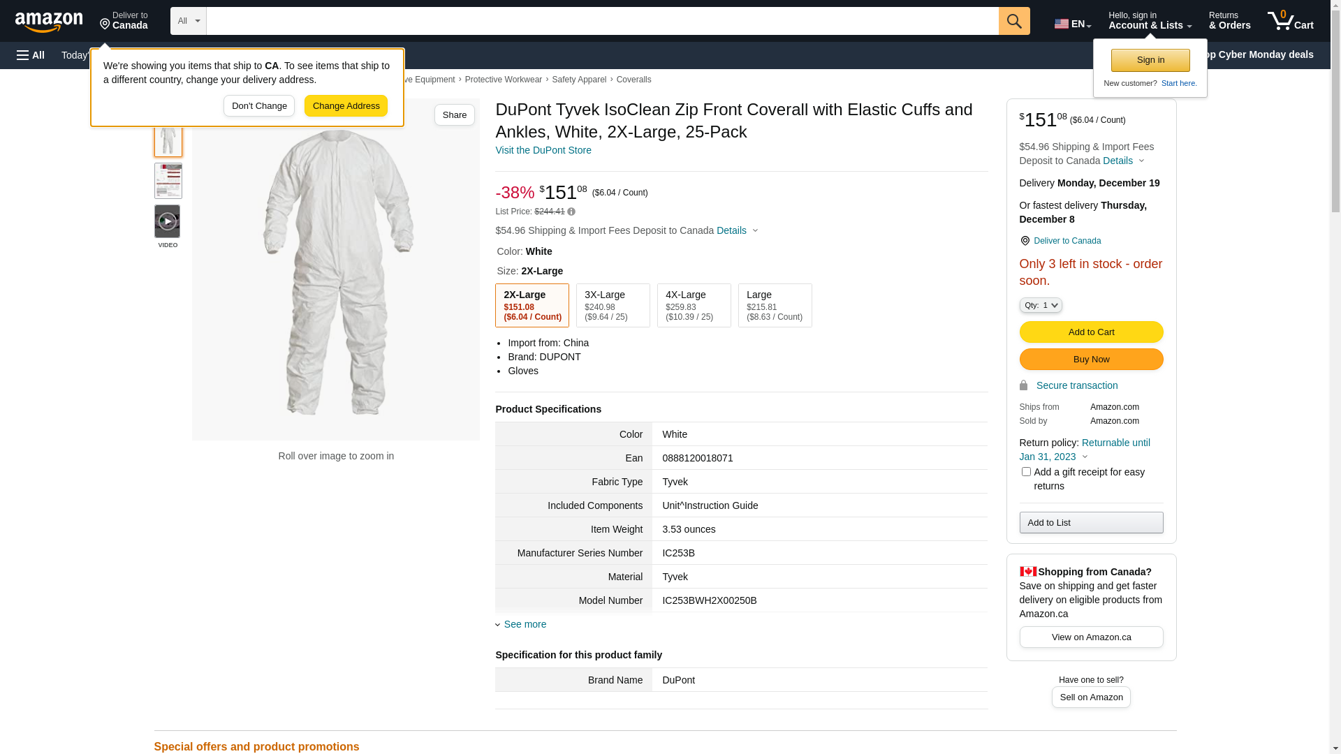 DuPont Tyvek IsoClean Zip Front Coverall with Elastic Cuffs and Ankles, White, 2X-Large, 25-Pack