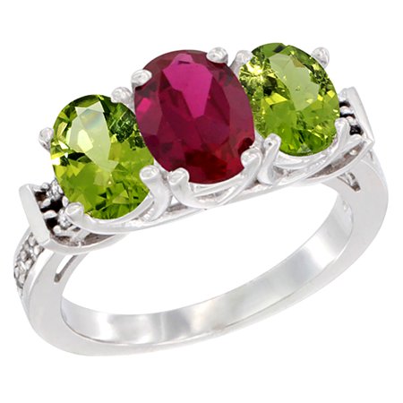 14K White Gold Enhanced Ruby & Peridot Sides Ring 3-Stone Oval Diamond Accent, sizes 5 - 10