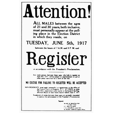 World War I Draft Poster Namerican Poster 1917 Calling On Men To Register For The Draft Following The Entry Of The United States Into World War I Poster Print by Granger Collection