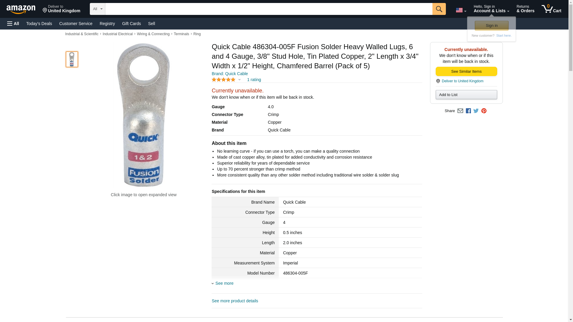 Quick Cable 486304-005F Fusion Solder Heavy Walled Lugs, 6 and 4 Gauge, 3/8" Stud Hole, Tin Plated Copper, 2" Length x 3/4" Width x 1/2" Height, Chamfered Barrel (Pack of 5)