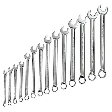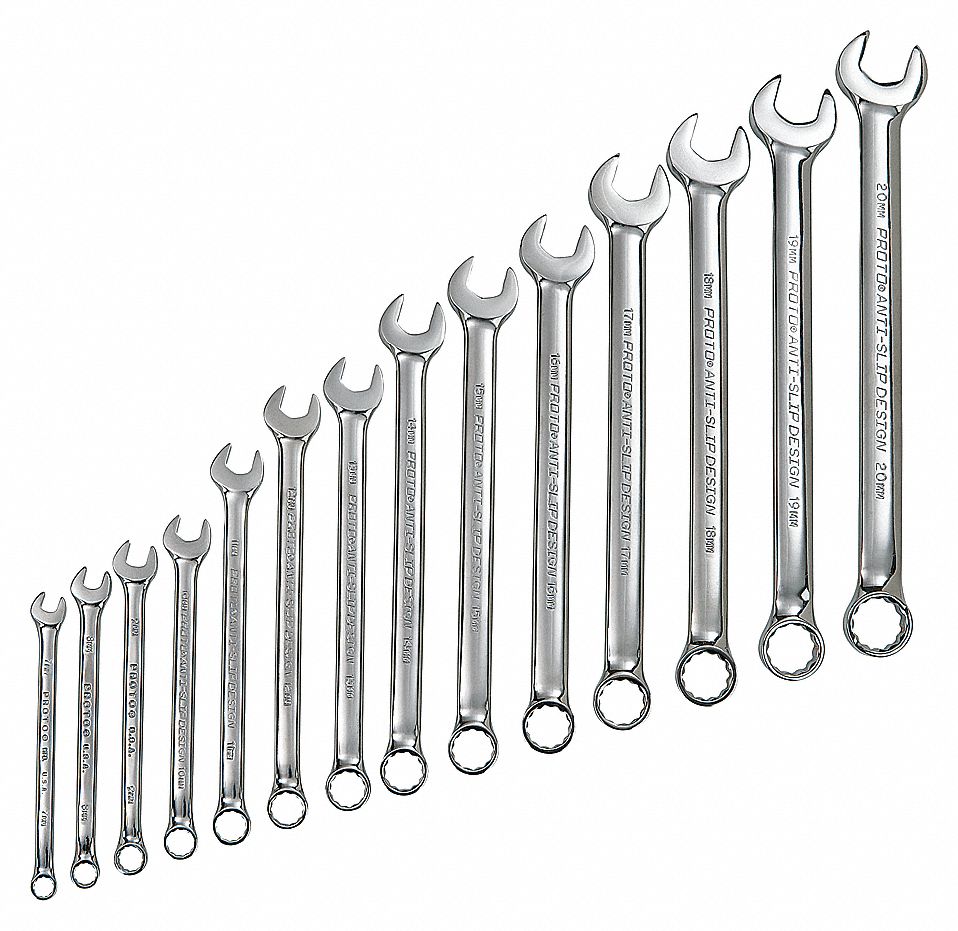 | Feature | <b>Price For:</b> Each <b>Head Angle</b>: 15 Degrees <b>Item</b>: Combination Wrench Set <b>Standards</b>: ASME B107.100 <b>Number of Points</b>: 12 <b>Tether Capable</b>: Standard Tool (Accessory Needed for Tethering) <b>Wrench Style</b>: Antislip <b>Wrenches Included</b>: 7, 8, 9, 10, 11, 12, 13, 14, 15, 16, 17, 18, 19, 20mm <b>Range of Lengths</b>: 5-5/32 to 11-27/64" <b>SAE or Metric</b>: Metric <b>Number of Pieces</b>: 14 <b>Finish</b>: Full Polish |
