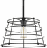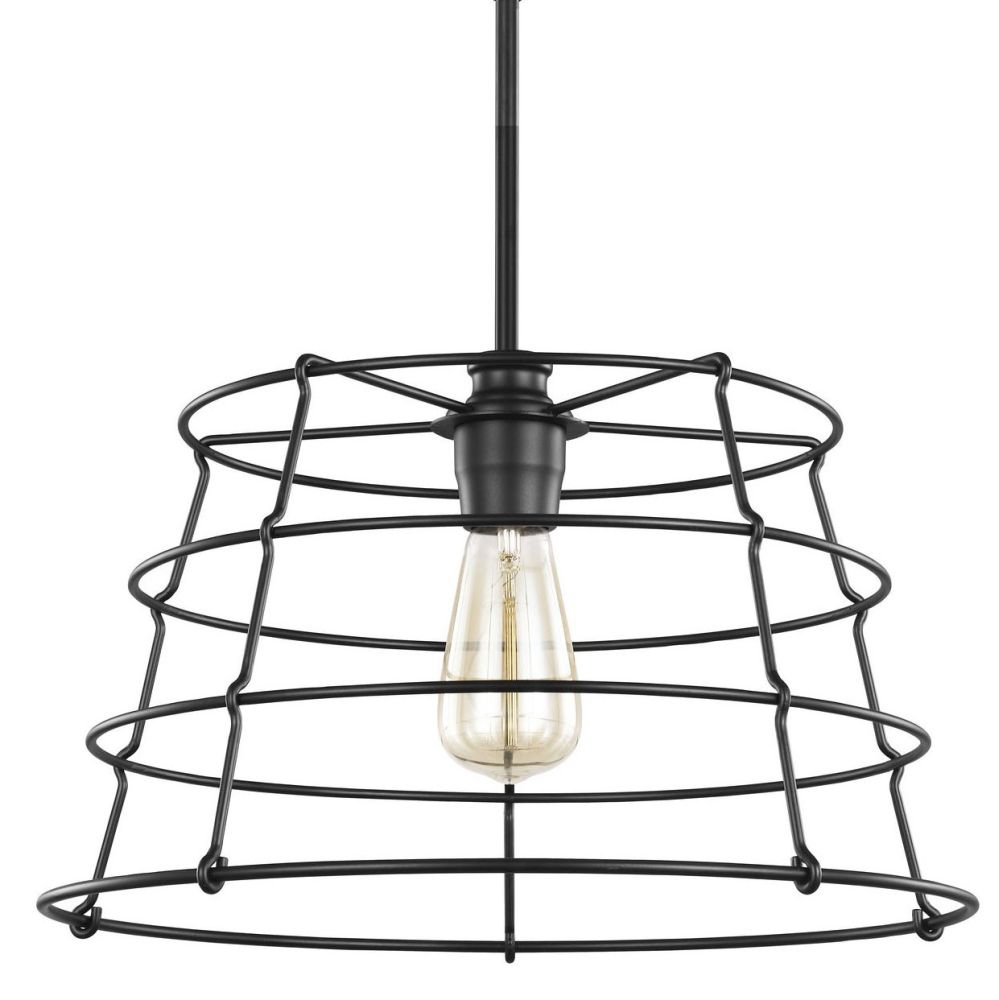 - Inside the open-cage shade is a vintage light bulb coated in a farmhouse-style black finish.