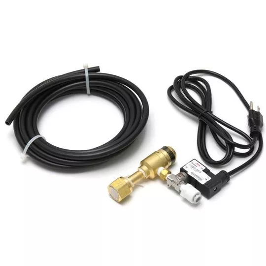 - Kit contains pressure reducing regulator, 110-VAC solenoid valve with power cord, nylon washer, flexible tubing and PVC check valve injector