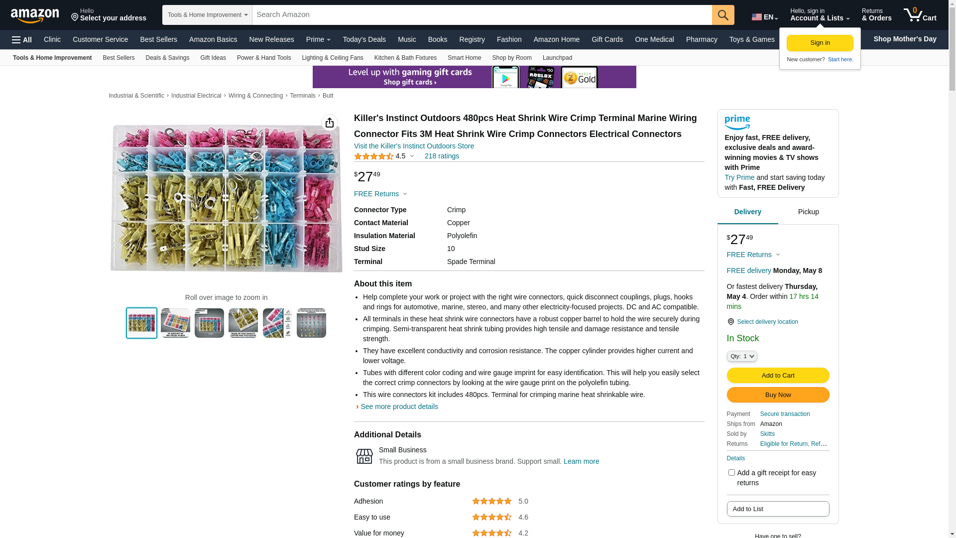 Description : 480pcs 3M Heat Shrink Wire Crimp Terminal Marine Wiring ConnectorDurable Insulated crimp terminals. Assorted crimp terminals and come with case. All are enclosed in plastic case for easy access. Made with 3M adhesive-lined heat shrink material.When properly heated and shrunk, they provide a seal that is resistant to water, steam, salt and other contaminants. Heat shrink insulated connectors will provide improved pullout strength and strain relief. Excellent splice for marine, automotive, outdoor, or harsh environment use. The translucent heat shrink material allows for visual inspection of the connection, and has the wire gauge printed on it.Crimp style with a true plated copper core. Made with 3M dual walled adhesive lined heat shrink tubing.The 480pcs assorted crimp terminals include : RED 22-18 ga. HEAT SHRINK RINGS #10, 1/4", 5/16" & 3/8" 20 ea. ............. = 80 PCS. RED 22-18 ga. HEAT SHRINK BUTTS .................................................................. = 20 PCS. RED 22-18 ga. .250 MALE AND FEMALE QUICK DISCONNECTS 20 ea. .... = 40 PCS. RED 22-18 ga. SPADE TERMINALS "FORKS" FOR STUD SIZE #10 ............. = 20 PCS. BLUE 16-14 ga. HEAT SHRINK RINGS #10, 1/4", 5/16" & 3/8".20 ea. ............... = 80 PCS. BLUE 16-14 ga. HEAT SHRINK BUTTS ................................................................... = 20 PCS. BLUE 16-14 ga. .250 MALE AND FEMALE QUICK DISCONNECTS .20 ea...... = 40 PCS. BLUE 16-14 ga. SPADE TERMINALS 'FORKS" FOR STUDE SIZE #10 .............= 20 PCS. YELLOW 12-10 ga. HEAT SHRINK RINGS #10, 1/4", 5/16" & 3/8" .20 ea............. = 80 PCS. YELLOW 12-10 ga. HEAT SHRINK BUTT CONNECTORS ..................................... ...= 20 PCS. YELLOW 12-10 ga. .250 MALE AND FEMALE QUICK DISCONNECTS ..20 ea.... = 40 PCS. YELLOW 12-10 ga. SPADE TERMINALS