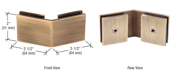 C.R. LAURENCE SGC135ABR CRL Antique Brass Square 135 Degree Glass-to-Glass Clamp. CRL Square 135 Glass-to-Glass Clamps have sharp corners. The glass can be mitered or flat edged. Clamp is designed to clamp 5/16" to 1/2" (8 to 12 mm) glass panels. They secure two glass panels meeting at a 135 degree angle. These Clamps have many uses, and are typically utilized in the fabrication of custom showcase displays, trophy cases, partitions, and "all-glass" enclosures. Available in a variety of popular finishes and styles to match designer hardware. Made of solid brass, these Clamps are engineered to remain beautiful for years with proper care and cleaning. Drawings and templates are available..