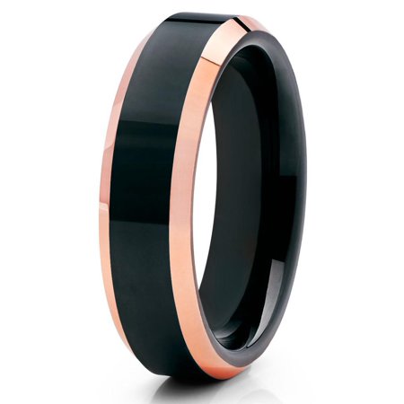 6mm Polished Black Tungsten Carbide Ring Beveled Rose Gold Edge Unisex Band 8.5