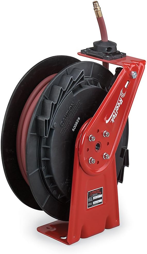 | Feature | Price For: Each Drive Type: Spring Return Hose Included: Yes Item: Hose Reel Bearings: Permanently Lubricated Application: For Maintenance Shops, Garden Shops, Woodworking, Light Industrial, Home Workshops, Machine Shops, Assembly Lines, Garages and Chip Blowing Finish: Powder Coated Latch: Locking Overall Height: 17-5/8" Reel Inlet: 1/2" (F)NPT Duty Rating: Light Duty |