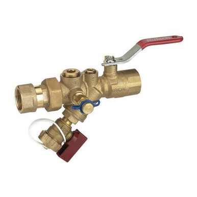 'Combination Strainer/Ball Valve, Connection Type FNPT x FNPT, Pipe Size 1 In., Body Material Forged Brass, Max. Pressure 600 psi WOG, Temp. Range Up to 250 Degrees F, Screen Material Stainless Steel, Handle Material Zinc Plated with Vinyl Grip, Handle Type Lever, Bypass Port Size 1/2 In., Drain Connection FNPT, Ball Material Chrome Plated Brass, Seal Material EPDM, Seat Material PTFE, Overall Length 6.03 In., Stem Type Blowout Proof, Stem Material Brass'