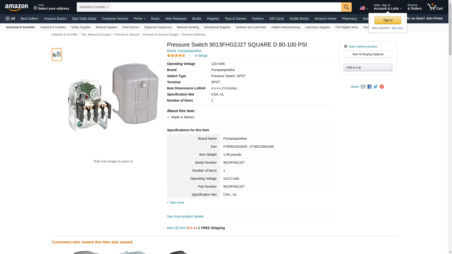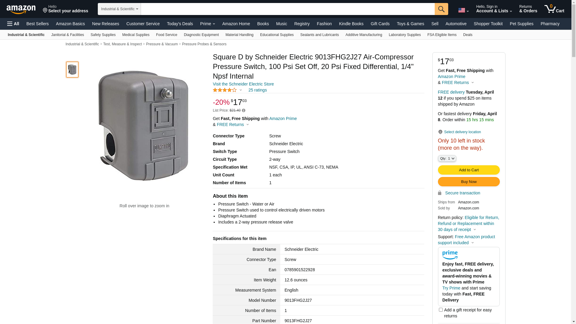 | Feature | Price For: Each HP @ 3 Phase - 480V: 1 Contact Form: DPST Range: 20 to 100 psi Item: Pressure Switch NEMA Rating: 1 Action: Standard HP @ 3 Phase - 240V: 3 HP @ 1 Phase - 240V: 2 Application: Air and Water Pressure Unloader: No Port Type: 1-Port 1/4" FNPS Country of Origin (subject to change): Mexico |