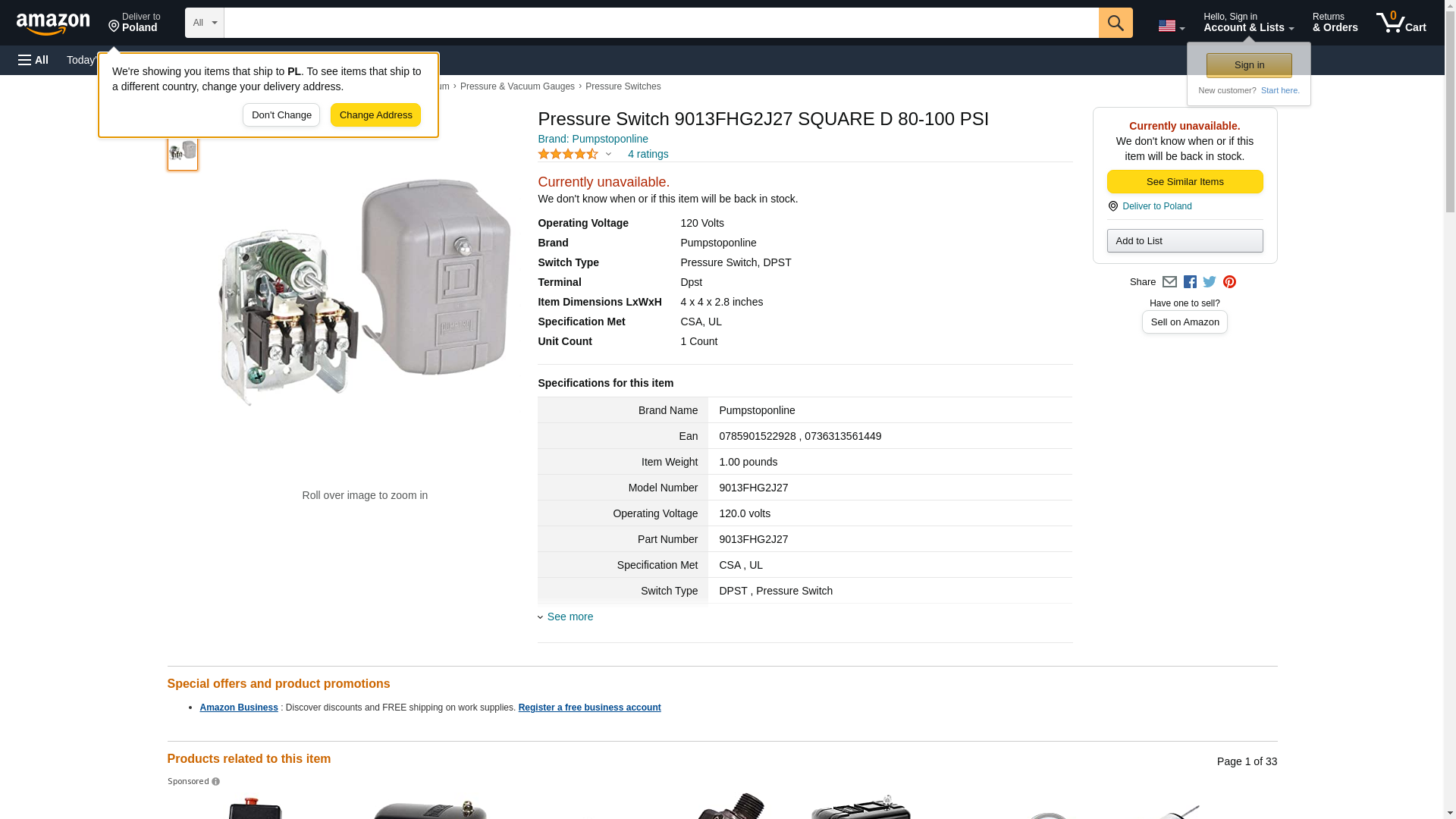 Pressure Switch 9013FHG2J27 SQUARE D 80-100 PSI