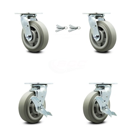 Thermoplastic Rubber Flat Tread Swivel Caster w/Main. Free Bearings Set of 4 w/6" x 2" Gray Wheels - Includes 2 Swivel with Bolt on Swvl Lcks&2 Swvl with Brakes-2000lbs Total Cpty-Service Caster Brand