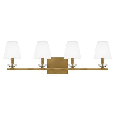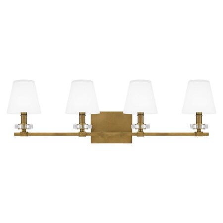 Designed for soft illumination, this contemporary four-light bath light is from Quoizel and the Kelsey Glen collection. It shows off a warm weathered brass finish with clear glass disc accents that gleam in the light. Classic empire shades are crafted in etched glass for diffused, true illumination at the vanity. Can also be installed with lights down should you desire.