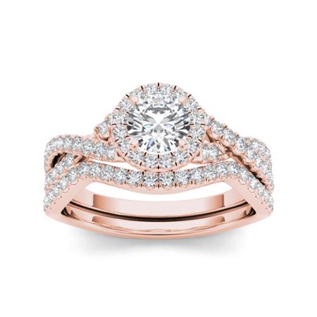 <ul> <li>De Couer New York engagement ring set features a matching halo-style engagement ring and wedding band</li> <li>Halo-style engagement ring and wedding band feature 82 round-cut prong-set diamonds totalling 3/8ct surrounding and flanking a 5/8ct round-cut prong-set white diamond solitaire</li> <li>All white diamonds have H-I color and I2 clarity, with both rings totalling approximately 1ct TDW</li> </ul>