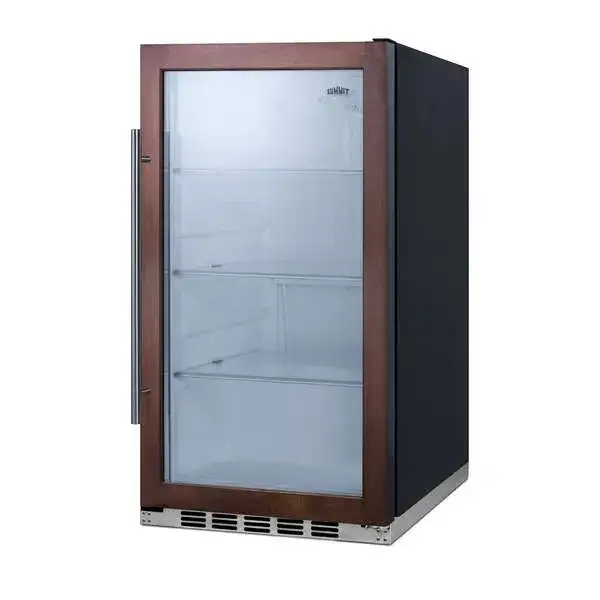 Summit Appliance SPR489OSPNR Commercially Approved Shallow Depth Indoor/Outdoor Beverage Cooler for Built-in or Freestanding Use with Panel-Ready Door Trim, Glass Door and Black Cabinet<br><br> Key Features:<br> - Shallow depth under 18" makes it ideal for smaller commercial and residential settings<br> - Designed and constructed for safe use in the outdoors<br> - Panel-ready door frame allows you to create a truly custom look under the counter<br> - Three glass shelves with six positions for optimal storage and easy cleaning<br> - Dial thermostat with seven temperature settings offers easy temperature management<br> - Commercially ETL-S listed to NSF-7 standard and meets UL-471 for use in commercial settings<br><br> Specifications:<br> - Height of Cabinet: 33.88"<br> - Width: 19"<br> - Depth: 17.75"<br> - Depth with door at 90°: 34.75"<br> - Capacity: 3.13 cu.ft.<br> - Defrost Type: Automatic<br> - Door: Glass/Panel-Ready Frame<br> - Cabinet: Black<br> - US Electrical Safety: ETL<br> - Canadian Electrical Safety: ETL-C<br> - Sanitation: ETL-S<br> - Energy Usage/Year: 285kWh/year<br> - Amps: 1.3<br> - Voltage/Frequency: 115V AC/60Hz<br> - Weight: 75 lbs.<br> - Door Swing: RHD<br> - Height Adjustable: Yes<br> - Shelf Type: Glass<br> - Shelf Qty: 3<br> - Adjustable Shelves: Yes<br> - Can Storage: Yes<br> - Thermostat Type: Dial<br> - Fan Type: Interior<br> - Refrigerant Type: R600a<br> - Refrigerant Amount: 0.88oz.<br> - High Side PSI: 320<br> - Low Side PSI: 120<br> - Level Legs Qty: 2<br> - Interior Light: Yes<br> - Temperature Range: 34 to 50ºF<br> - Sound Level: 32.6 dB<br> - Interior: 29"x16"x12.75"<br> - Compressor Step: 7"x16"x6.25"
