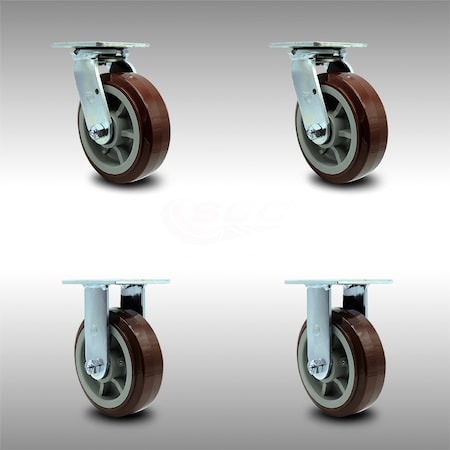 Stainless Steel Polyurethane on Polyolefin Swivel Top Plate Caster Set of 4 w/6" x 2" Maroon Wheels - Includes 2 Swivel & 2 Rigid - 3600 lbs Total Capacity - Service Caster Brand