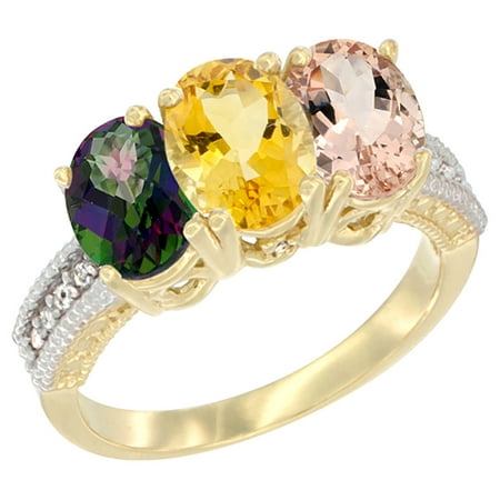 14K Yellow Gold Natural Mystic Topaz, Citrine & Morganite Ring 3-Stone 7x5 mm Oval Diamond Accent, sizes 5 - 10