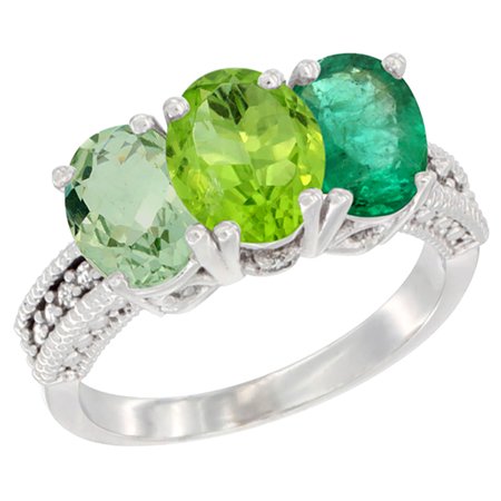 14K White Gold Natural Green Amethyst, Peridot & Emerald Ring 3-Stone 7x5 mm Oval Diamond Accent, sizes 5 - 10