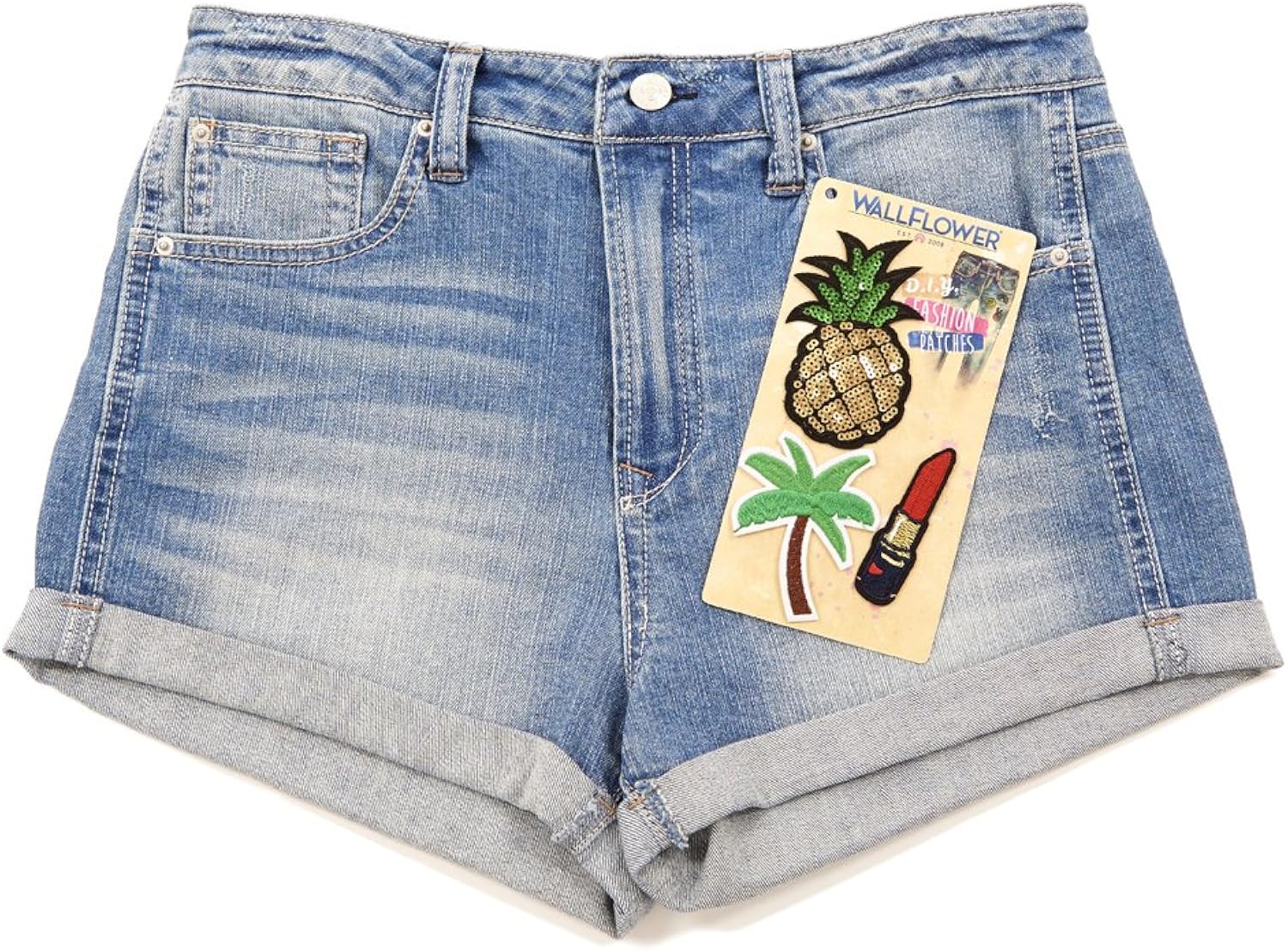 This DIY High Waisted short is so fun because it features 3 removable patches, single button closure and basic 5 pockets! We leave it up to your creativty where you place the patches. WallFlower Jeans is a lifestyle brand that provides stylish looks from head-to-toe at an exceptional value. The brand offers jeans from Classic and Curvy to Plus Size options in a variety of washes. In addition to denim, they offer tops, dresses, outerwear, loungewear, sleepwear and intimate apparel, watches and jewelry.