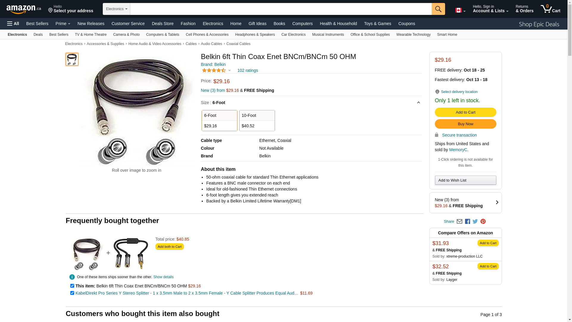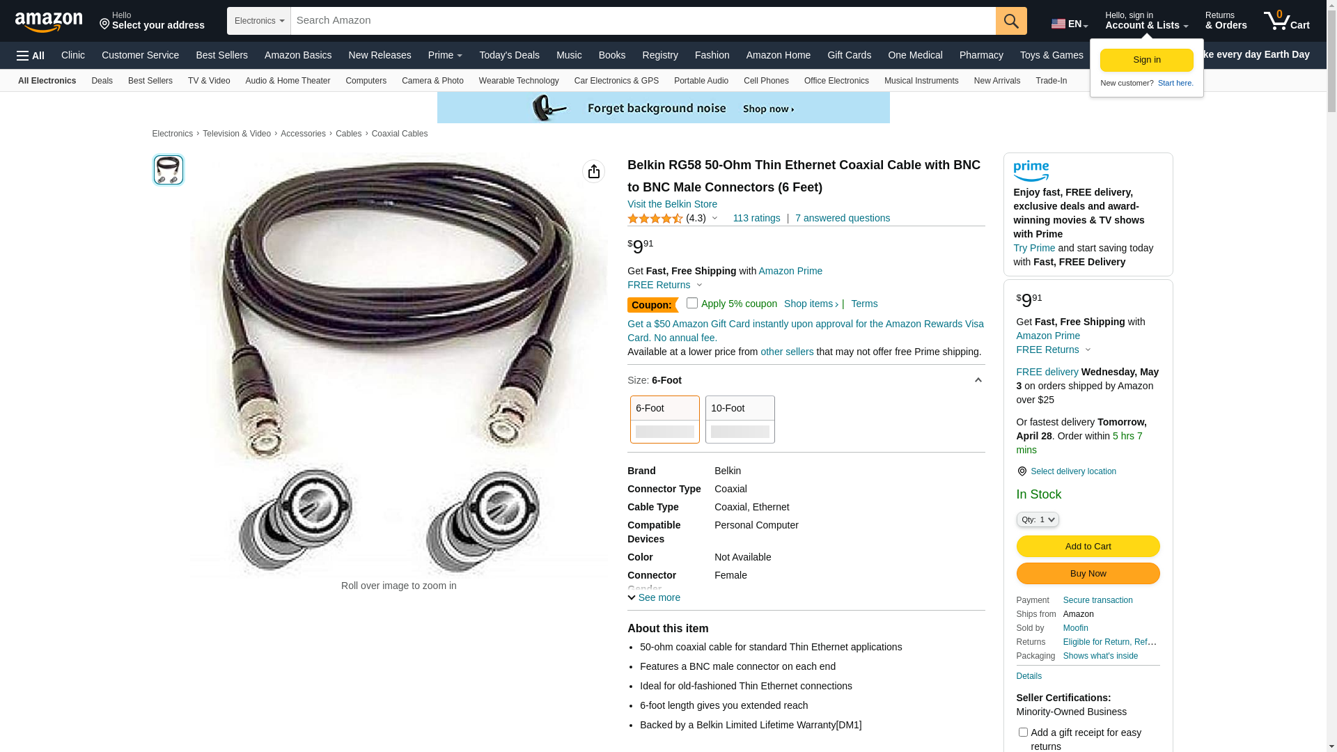 Belkin RG58 50-Ohm Thin Ethernet Coaxial Cable with BNC to BNC Male Connectors (6 Feet)