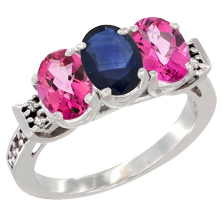 10K White Gold Natural Blue Sapphire & Pink Topaz Sides Ring 3-Stone Oval 7x5 mm Diamond Accent, sizes 5 - 10