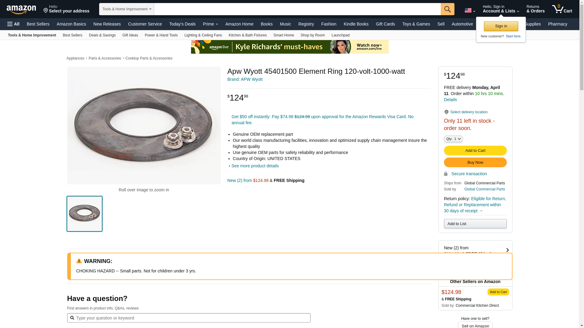 Apw Wyott 45401500 Element Ring 120-volt-1000-watt