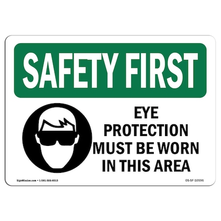 OSHA Safety First Sign - Eye Protection Must Be Worn with Symbol | Rigid Plastic Sign | Protect Your Business, Work Site, Warehouse & Shop Area | Made in The USA