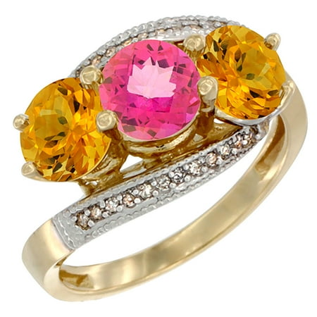 14K Yellow Gold Natural Pink Topaz & Citrine Sides 3 stone Ring Round 6mm Diamond Accent, sizes 5 - 10